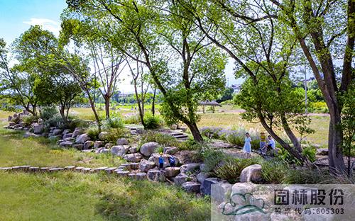 旁邊的一個(gè)樹島,用柴火和鋼管做出“鳥巢”形狀,雖稍顯“凌亂”,但卻顯得分外自然;再前方的一個(gè)樹島,增加“五指”塑石景觀,遠(yuǎn)遠(yuǎn)看去,好像一只大手托舉著大樹;穿過田間小路,來到幾棵大樹組成的樹林,錯(cuò)落有致的景石形成一個(gè)自然的圍合空間,林間小路用舊木頭鋪成,道路兩邊用紫色鼠尾草、刀茅等植物巧妙搭配出清新的花境,坐在樹下的石頭上小憩,看著孩子們?cè)谧分疰覒?,仿佛回到了兒時(shí)和小伙伴在村口大樹下游玩打鬧的時(shí)光,關(guān)于故鄉(xiāng)的回憶充盈在心間。