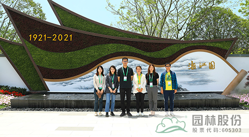 浙江園深化設(shè)計負責人高博、花境施工負責人張楠等在浙江園入口合影