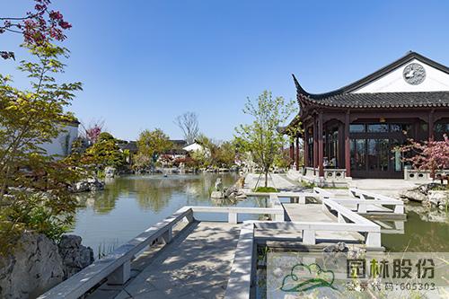 除了植物、園路等,建筑、曲橋、廊架、照壁等也在園區(qū)內錯落有致地分布,在有序劃分空間的同時,營造出移步換景的園林景觀。