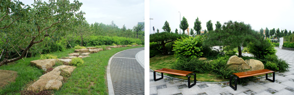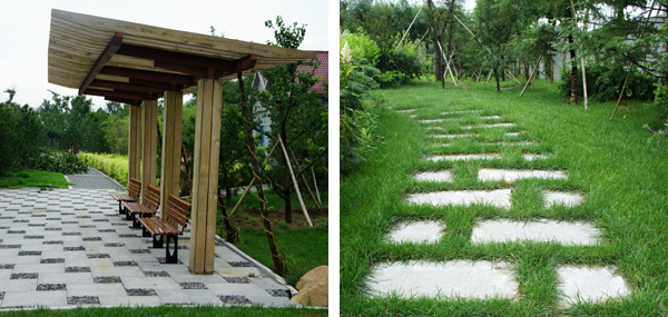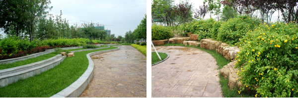 而在道路十字路口的節(jié)點(diǎn)處,則主要是用10cm×10cm的小花崗巖鋪地,鋪出來(lái)的路面整潔、平坦,看似簡(jiǎn)單,實(shí)則對(duì)施工技術(shù)要求相當(dāng)高。草坪中的地面鋪裝,則采用花崗巖汀步,用錯(cuò)縫鋪裝法,兩塊花崗巖之間用草皮鑲嵌,就像給每塊花崗巖鑲了一道綠邊,與旁邊的草坪和諧地融為一體。貫穿整個(gè)工程的游憩步道,全部采用"人字形"的鋪裝方法,中間用透水磚、兩邊以花崗巖鑲邊,透水磚價(jià)格不高,用以鑲邊的花崗巖是利用了鋪裝中剩余的邊料,雖然用料簡(jiǎn)單,但通過(guò)對(duì)技術(shù)的嚴(yán)格要求,鋪出的路面卻整潔而不失韻味,是一種實(shí)用、環(huán)保、節(jié)約的做法。