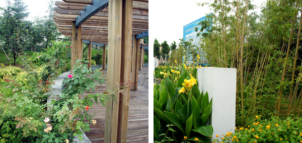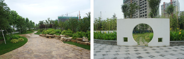 每個(gè)景觀節(jié)點(diǎn)上,植物的配置方法都是不一樣的,如在下沉廣場(chǎng),主要是以小龍柏、金葉女貞等小灌木片植成方形或弧形,間或點(diǎn)綴石楠、梅樹,看起來(lái)規(guī)整、簡(jiǎn)潔;而在設(shè)計(jì)風(fēng)格為江南園林的南廣場(chǎng)上,是將貴重的造型油松單植,通過(guò)不同的組合,形成三個(gè)風(fēng)格相近的綠島,周邊種植美人蕉、玉簪、竹子,并砌起白墻,上面開圓形拱門或圓窗,散發(fā)出詩(shī)意江南的靜謐和婉約氣息。"游憩步道是貫穿整個(gè)景觀的軸線,為了形成曲徑通幽的景觀效果,我們將對(duì)植、孤植、叢植都多種方法結(jié)合運(yùn)用,特別是在三叉路口,多種植海棠、櫻花、杏花等,一方面,花開的時(shí)候,綠葉間繁花點(diǎn)點(diǎn),會(huì)吸引人們不斷向前探尋更多的美景;而花落之后,茂密的枝葉又形成隱隱約約的視覺(jué)感受,前方轉(zhuǎn)過(guò)彎后風(fēng)景什么樣,又讓人很想去看看。"高經(jīng)理笑著說(shuō)。
