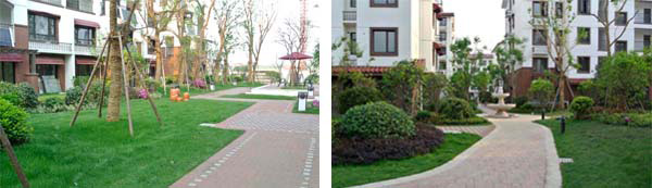 楊經(jīng)理說:“紫荊東郡的植物配置以統(tǒng)一中富于變化為原則,上層苗木主要選擇大規(guī)格的香樟、無患子和馬褂木等,中下層則以桂花、雞爪槭、紅葉石楠球、金森女貞球等常見的球類灌木及地被苗進(jìn)行組團(tuán),苗木的種類雖然不是很豐富,但在配置上卻形式多樣,特別是通過在施工時(shí)對(duì)設(shè)計(jì)的再深化,要求在植物種植時(shí),樹形、色彩、線條、質(zhì)地及比例都要有一定的差異和變化,顯示多樣性,但相互之間又有一定的相似性,從而使得整體的植物配置在和諧統(tǒng)一中顯得生動(dòng)活潑,簡(jiǎn)單而不單調(diào),統(tǒng)一而不呆板,營(yíng)造出一種寧靜、閑適的氛圍?!?/p>