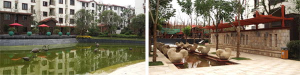 在紫荊東郡小區(qū),水景隨處可見,從主入口兩側(cè)近50米的景觀橋水景,到入口正前方一個(gè)大型的石雕噴泉,再到小區(qū)里面幾條主干道交匯的十字路口的小型地面噴泉,中心水景上的圓形石雕噴泉,特別是不遠(yuǎn)處的動(dòng)物噴泉雕塑,只只鶴低頭凝思,細(xì)長(zhǎng)的水流從鼻端的出水口處流出,落入下方的水池里,更是格外引人注目。“這些水景小品具有的藝術(shù)特性與審美效果,加強(qiáng)了整個(gè)景觀環(huán)境的藝術(shù)氛圍,成為讓空間環(huán)境生動(dòng)起來的關(guān)鍵因素,在提高小區(qū)藝術(shù)品質(zhì)和景觀形象的同時(shí),更給人們帶來美的享受。”楊經(jīng)理如是說。