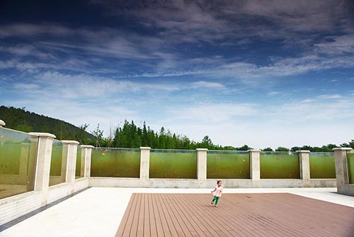 沉水廊道:總長148米,其中,北面60米,南面88米,整個廊道內(nèi)湖水域面積達1.1萬平方米,堪稱中國廊道景觀之最。廊道兩側(cè)以透明的亞克力玻璃隔斷湖水,通過先進的水凈化系統(tǒng)對湖水進行循環(huán)凈化處理。遠觀沉水廊道,宛如蛟龍蜿蜒盤桓于湖面之中,將整個云龍湖一分為二,猶如太極中的陰陽兩儀,充分體現(xiàn)了道家文化;兩頭又與玉珠島呈二龍戲珠之勢。游人行走其中,可以欣賞各種魚類嬉戲于水生植物之間,仿佛置身于水族館之中,同時又可以觀賞到玉珠島的奇石、奇花與奇樹??芍^是匠心獨運。