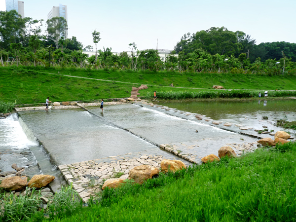 該工程完工后,淺而寬闊的河道,清亮透徹的河水,駁岸上青青的草地,色彩艷麗的花卉,極具創(chuàng)意的硬質小景,小巧的疊水平臺……如畫的生態(tài)美景和多彩的濱河景觀讓人備感身以愉悅,成為深圳市民散步休閑的好去處。