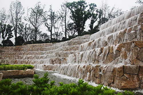 入口水景開闊大氣,行道樹陣整齊劃一。一場歌劇的序曲,不管是澎湃激昂,還是歡快活躍,抑或是柔情舒緩,都將對整個局情起著舉足輕重的作用。入口景觀的作用同樣如此,它是整個園林工程留給人們的第一印象。走進項目主入口,寬40米、高10米的寬闊水景,高達7級的層階落差,水流層層跌落間,水聲轟鳴,仿佛一道瀑布橫掛眼前。3000平方米的地面鋪裝,全部采用50毫米厚的深灰色和芝麻白花崗巖,走在上面,平坦、踏實。兩側的花壇,邊緣鋪設手法也呈臺階狀,蘑菇石貼面,花崗巖壓邊,與水景遙相呼應?;▔械闹参?,上層選用香樟、銀杏、櫸樹,中層用櫻花、紅葉李,下層用麥冬、水蠟、花石榴及草花,再加上造型樹的點綴,營造出群島效果,使得整個入口景觀莊重典雅,大氣天成。