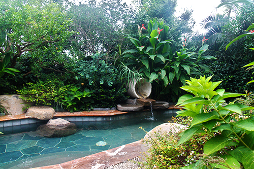 露天泳池熱帶風情,溫泉泡池仿若天成。露天泳池區(qū)景觀獨具特色,選用華棕、棕櫚、布迪椰子、加拿利海棗等熱帶植物作為主景,營造出簡約大方、層次分明的濃郁熱帶園林風情。為了提高這些熱帶植物的成活率,降低后期的養(yǎng)護成本,這批植物都經過馴化,較能適應吳江的氣候條件。該區(qū)面積較大,從酒店的觀景平臺上往下看,泳池中間的小島就像彎彎的小船,仿佛要順流而下;水質清澈見底,水底大面積的藍色和黃色玻璃馬賽克,營造出波光鱗鱗的效果,流動的線條瞬間充滿了生機和活力,整個泳池仿佛都動了起來。