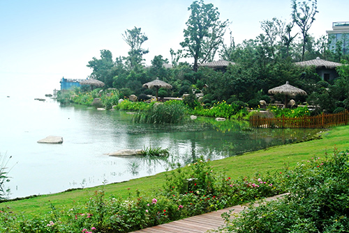 該項目將“以人為本,尊重自然”貫穿于設計到施工的各個環(huán)節(jié),為了最大限度地保護太湖水域環(huán)境,各個施工環(huán)節(jié)中,因地制宜,因材施用,在駁岸處理中,通過草坪入水、水生植物種植、景石運用等方法,在充分保護原有湖岸的基礎上,加強對湖水水質的凈化,營造出生態(tài)、自然的湖岸景觀,成為項目中的一景。此外,種植的植物,大量選用當?shù)剜l(xiāng)土樹種,既營造出濃郁的景觀特色,又有利于提高植物的成活率,減少后期的養(yǎng)護費用,有效節(jié)約了工程成本。