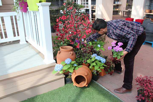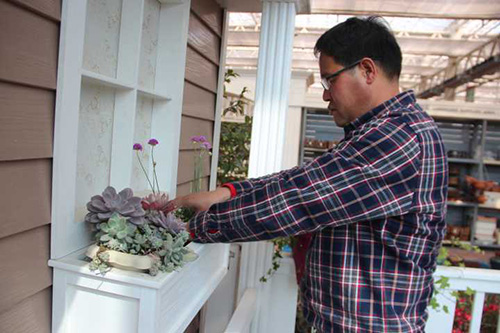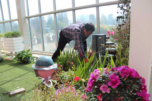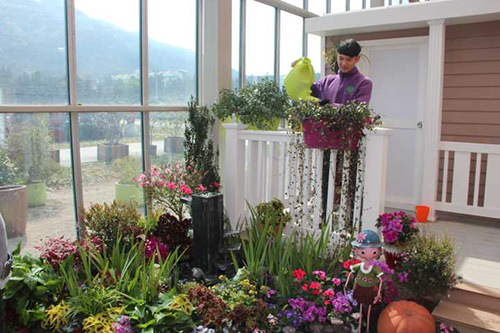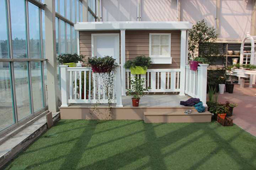 ▲我們選擇園藝中心室內一處小木屋的陽臺,作為造景點。園藝師現(xiàn)場查勘后,初步確定花境布置點的面積和風格。
