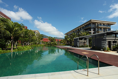 項目位于海南省三亞市亞龍灣椰風(fēng)路南部,整體景觀顯得張弛有度,開闊大氣的廣場鋪裝、宛若綠色地毯般的草坪、色彩豐富長勢茂盛的植物、藍(lán)寶石般的碧藍(lán)泳池……規(guī)整中不失自然,簡潔中深藏精致,盡顯現(xiàn)代主義風(fēng)情的園林美景。