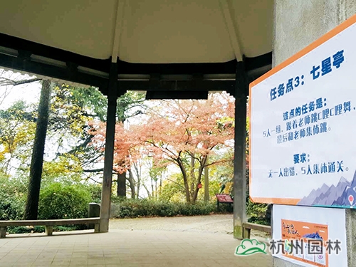 本次活動的終點為玉皇山頂?shù)摹敖挥[閣”。玉皇山是杭州絕佳的觀秋景高地,站在山頂,可俯瞰杭州全城,八卦田的神秘、西湖的絢麗等盡收眼底;山上則是古樹參天,紅葉似火,黃葉賽金,彩林岑巒疊峰,如入畫里。大家從玉皇山北門上山,途經(jīng)林海亭、老玉皇宮、櫻花地、紫來洞天、七星亭,最后到達(dá)山頂?shù)摹敖挥[閣”。此次登山途中設(shè)立了3個任務(wù)點,參加活動人員需要完成相應(yīng)任務(wù),才能蓋章通關(guān)。