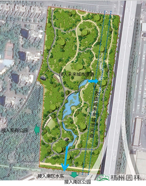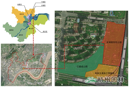 江干區(qū)東湖路市民公園位于東湖路與九喬街西南角,毗鄰九月庭院和泊林印象小區(qū),是江干區(qū)“一帶生態(tài)功能區(qū)”的“運河—錢塘江—東湖路”U型生態(tài)軸的重要節(jié)點。結(jié)合已建成公園和高架互通施工預(yù)留地,對東湖路市民公園進行統(tǒng)一規(guī)劃。