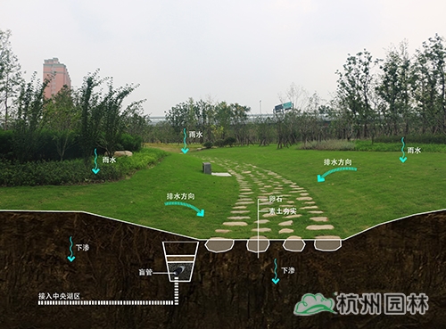 場地現(xiàn)場原為荒地,周邊居民在此種植蔬菜等,比較雜亂。場地周邊有排水渠道, 已建成公園內(nèi)的水系也為死水。其次,項目場地共有6組不同高度土堆,在設(shè)計過程中,將場地因素整合考慮,合理利用,遵循節(jié)約型園林的營建原則,追求綠色基地下的資源收集與利用,在此基礎(chǔ)的考慮下決定做一處海綿公園。