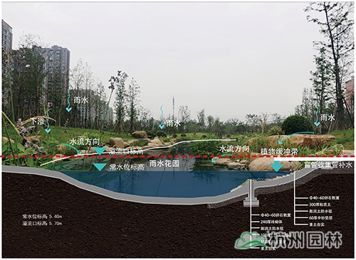 旱溪布置于帶狀綠地低洼處。設(shè)計時仿造自然界中干涸的河床,配合濕生植物的營造,在意境上表達出溪水的景觀。降雨時可減緩地表徑流,起到緩排作用。旱溪底部接盲管,將水導入中央湖區(qū),進行儲存。