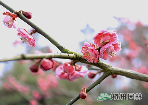 梅花Armeniacamume Sieb,薔薇科梅屬,落葉喬木,高達10m?;?/span>l~2朵單生,具短梗,芳香,在冬季或早春葉前開放。梅樹蒼勁古雅,疏枝橫斜,梅花傲霜斗雪、凌寒獨開、清雅俊逸。栽培歷史長達2500年以上。古樸的樹姿,素雅的花色,秀麗的花態(tài),恬淡的清香,和豐盛的果實,自古以來就為廣大人民所喜愛,為歷代著名文人所謳歌。賞梅之風(fēng)自古至今連綿不絕,賞梅以聞香、觀姿、品風(fēng)骨為主。