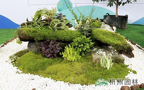現(xiàn)場共布置了四個小場景,前方左側(cè)以自然形狀的植物造景為主,通過各種花開植物與常綠、色葉等植物的巧妙搭配,展現(xiàn)庭院中向陽處的植物應(yīng)用和景觀效果;前方右側(cè)以各種塔形、圓形、方形、球形等造型植物為主,通過高低錯落的有機布置,展現(xiàn)各種造型植物在景觀中的應(yīng)用效果;后方左側(cè)以松磷堆疊出地形,用佛甲草圍合,以金鐘花、月桂等植物點綴,展示庭院一角的造景效果;后方右側(cè)則是一處苔蘚微景觀,以白石子鋪底,通過枯木、苔蘚、礬根及豐富的蕨類植物等的搭配,配以起伏的地形,營造出一片寧靜清新的小森林般的陰生景觀。