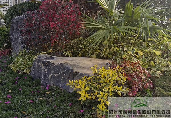 項(xiàng)目中應(yīng)用了許多景石,為了避免出現(xiàn)視覺的疲憊,每塊景石的形態(tài)、大小、植物配置都各有千秋。在一些入口和節(jié)點(diǎn)處,通過景石與色葉植物、開花植物、球類植物的有機(jī)搭配,營造出一個(gè)個(gè)意趣盎然的花境景觀。