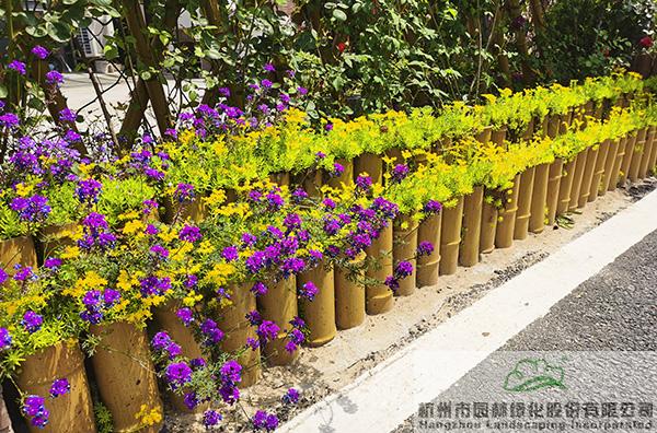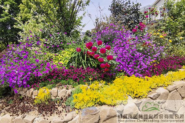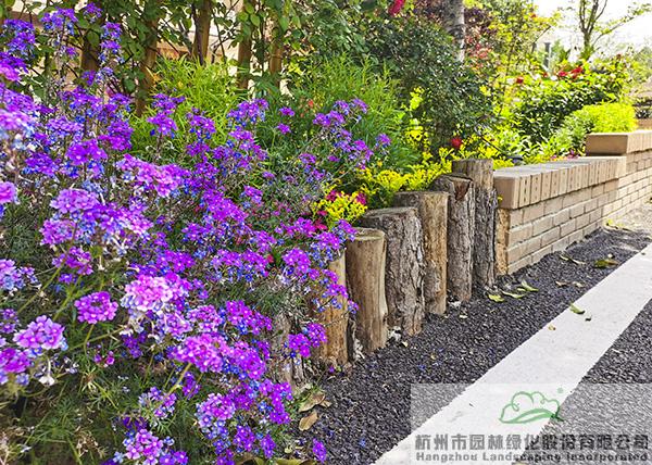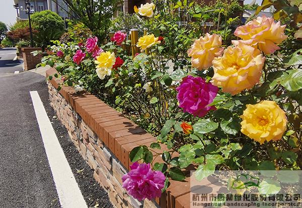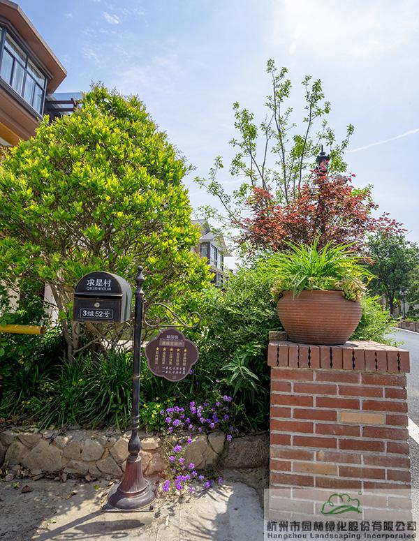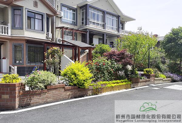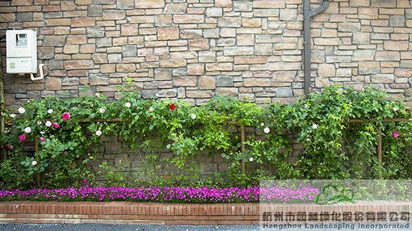 景墻邊的植物配置同樣有講究。利用銀杏、桂花、梅花、紅楓等植物營造上層空間,這些植物具有遮擋作用,能夠為庭院營造一定的私密空間。通過樹狀、球狀、攀援、傘狀、字母等各種形態(tài)的月季,金冠女貞球、龜甲冬青球、銀姬小蠟球、藍莓、八仙花、小葉梔子、翠蘆莉、花葉千鳥花、藍山鼠尾草、紫葉狼尾草等小喬灌木,在打造中層空間的同時,和美女櫻、金娃娃萱草、花葉玉蟬花、花葉香桃木、紫菀、澤蘭、礬根、五彩絡石、石竹等下層空間植物一起,裝飾和襯托景墻,使家家戶戶的景觀更加豐富多變。