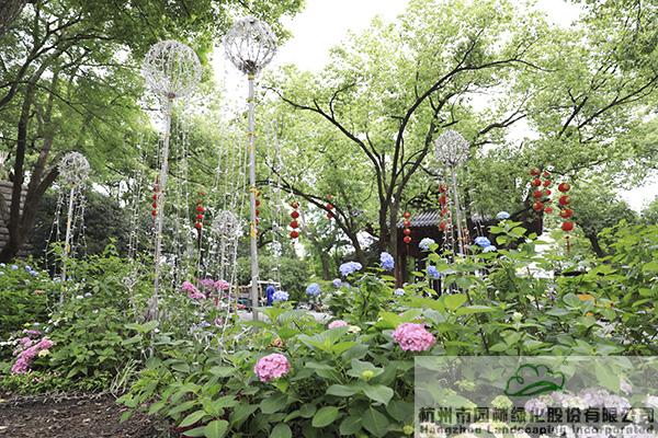 作為本次活動(dòng)的贊助單位,杭州市園林綠化股份有限公司聯(lián)手繡球花產(chǎn)業(yè)國(guó)家創(chuàng)新聯(lián)盟,在城隍閣古樹(shù)平臺(tái)布置了《花落花開(kāi),年華度》為主題的八仙花景觀展示區(qū),“閣樓觀湖二十年,繡球花燈滿堂前”,通過(guò)代表浪漫與愛(ài)情之美的繡球花境組團(tuán),結(jié)合錯(cuò)落有致的景觀挑燈和蜿蜒向前的時(shí)間軸序,營(yíng)造出繁花如繡、前程似錦的美好寓意,以此向城隍閣開(kāi)放20周年獻(xiàn)禮。