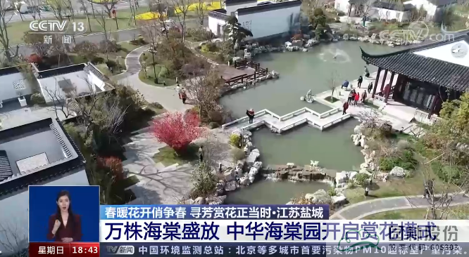 “春暖花開(kāi)俏爭(zhēng)春,尋芳賞花正當(dāng)時(shí)?!?月28日,央視CCTV13新聞?lì)l道《共同關(guān)注》及《東方時(shí)空》兩個(gè)欄目,先后在熱播時(shí)段,報(bào)道江蘇鹽城中華海棠園內(nèi)海棠花盛開(kāi)的美景,為當(dāng)?shù)靥ご郝糜巍板\上添花”!