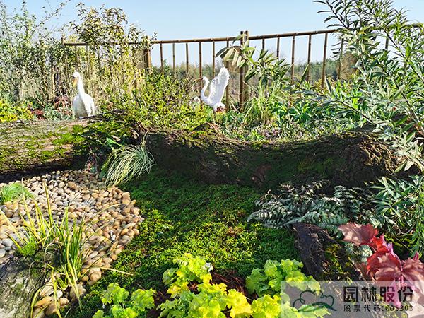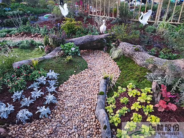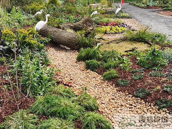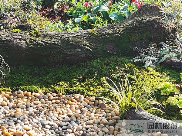 ①模擬苔蘚植物的生境條件,將蘚類濕地景觀與枯木結(jié)合,在枯木與卵石道路交叉部位布設(shè)小水塘,保持苔蘚生長環(huán)境土壤濕度。