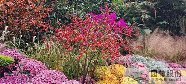 一種是未落葉的北美冬青,紅果掩映在綠色葉片中,活潑可愛。球菊和蟹爪菊都是球狀,自然舒展形態(tài)的北美冬青打破了該處單調(diào)的格局,同時(shí)也在高度上進(jìn)行了過渡。