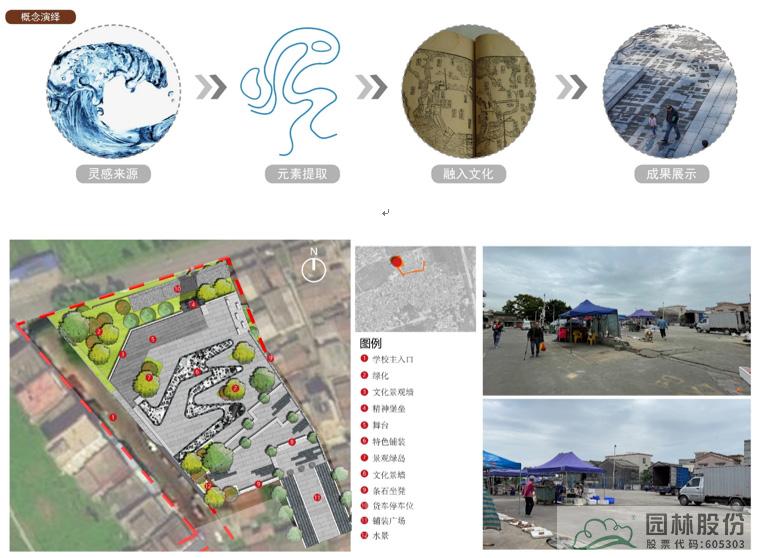 入口休閑廣場概念演繹設計說明:現(xiàn)狀場地主要為一片空地,由于南面是菜場,因此該場地在功能性上主要有貨車卸貨的功能,考慮村莊內(nèi)可能舉辦大型祭祀活動或者紅白喜事,需要有大空間,所以在設計中留出了大片場地。因沿海城市,所以提取了海浪元素,結合當?shù)貧v史文化及村落肌理,做出如圖設計。